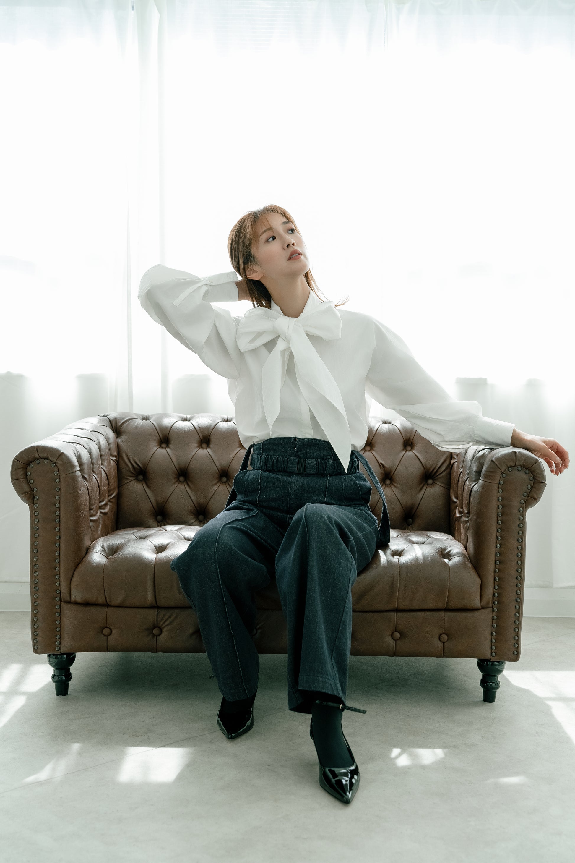 ■ ユニークなフォルムの袖は、カジュアルにもエレガントにも着こなせるデザインに。シンプルなコーディネート意外にも、ニットやベストと組み合わせて、シャツの袖や裾を見せるスタイリングもおすすめです!