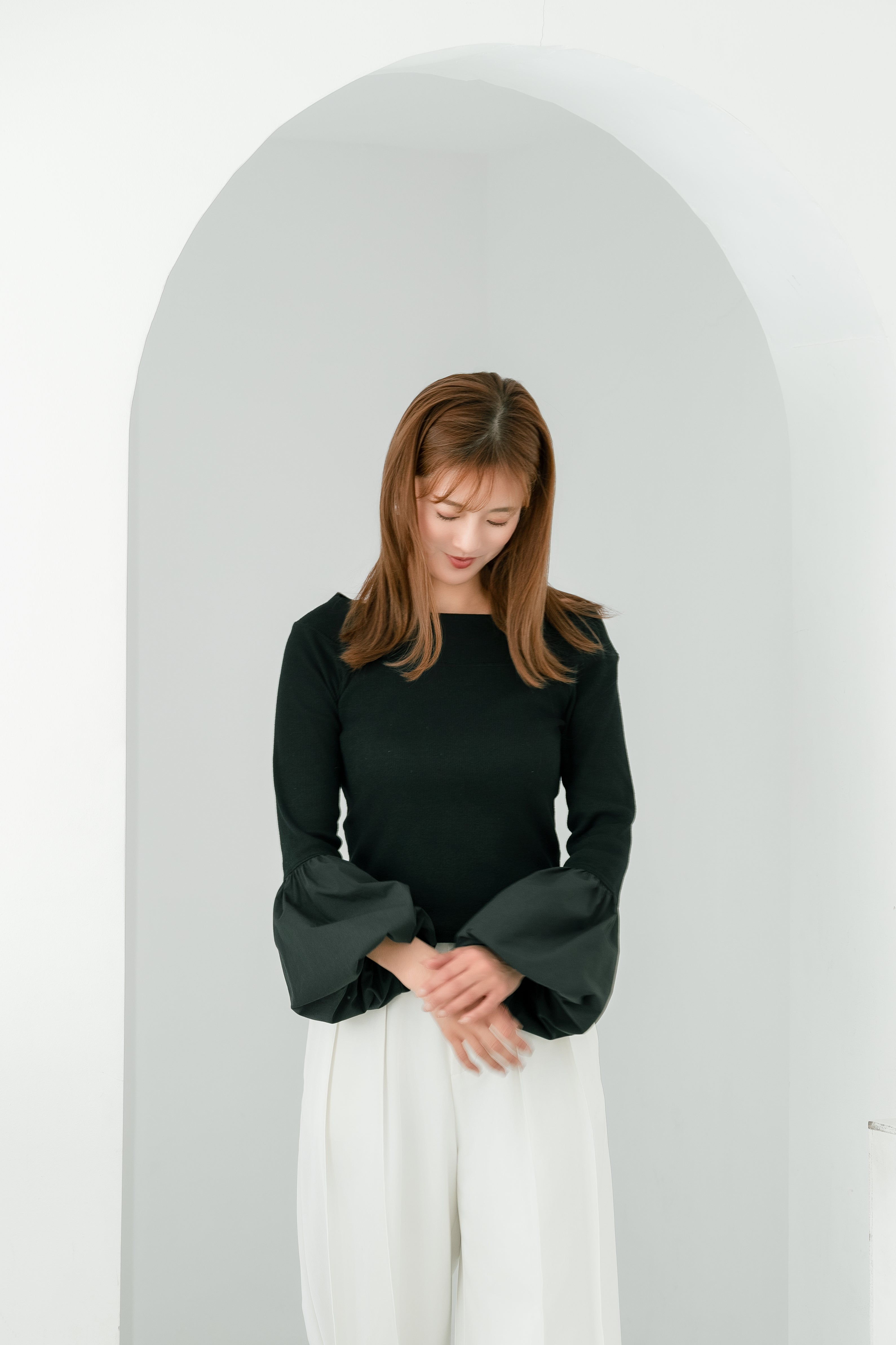 BALLOON SLEEVE COTTON RIB KNIT【BLACK】